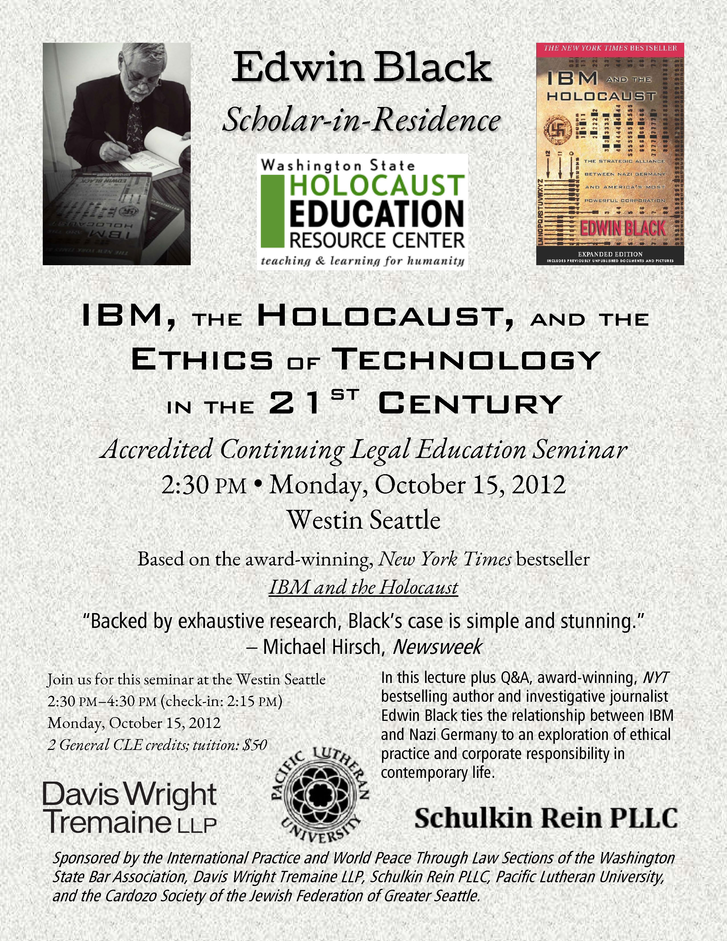 Presented by the Washington State Holocaust Education Resource Center and sponsored by the Washington State Bar Association in association with the WSBA's International Practice and World Peace Through Law Sections; co0-sponsored by Davis Wright Tremaine LLP, Schulkin Rein PLLC, Pacific Lutheran University, and the Cardozo Society of the Jewish Federation of Greater Seattle.